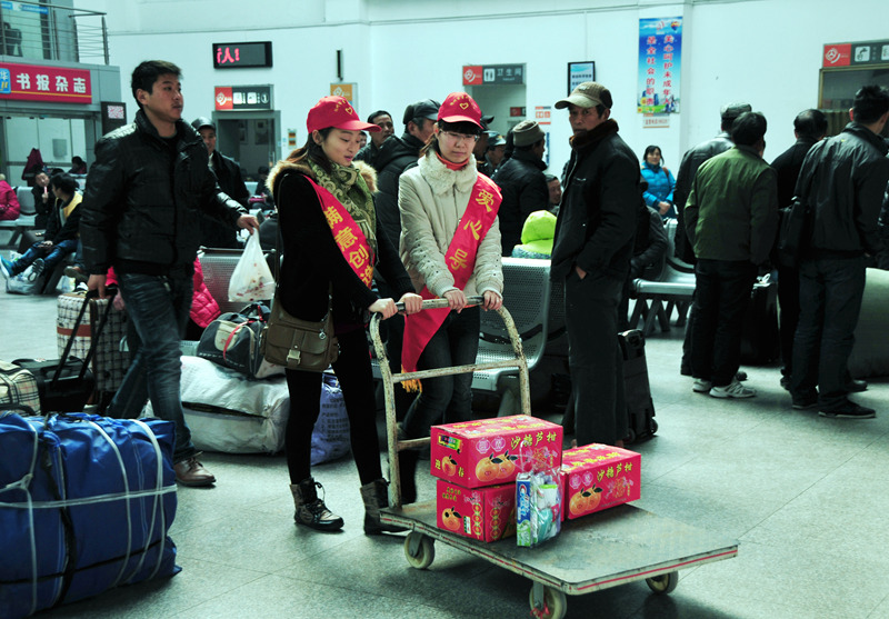 來自揚(yáng)汽集團(tuán)和團(tuán)市委組織的志愿者們有的在進(jìn)站口向旅客指引車站售票、候車等各個(gè)功能區(qū)位置;有的在服務(wù)臺回答旅客咨詢;有的在安檢處勸導(dǎo)旅客把攜帶的物品放上危險(xiǎn)品檢查儀安檢;有的推著“雷鋒車”幫行李較多的旅客拖運(yùn)箱包;有的給候車的旅客倒上一杯熱水;有的在檢票口幫助維持現(xiàn)場秩序,避免發(fā)生擁堵;還有的在候車大廳勸導(dǎo)旅客請勿吸煙……