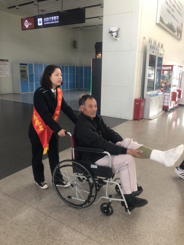 不一會兒,陪同的工友買好了當(dāng)天10:30分前往昆山的車票。高娟和另一位工作人員彭素青借來了輪椅,二人推著他來到了二樓發(fā)車檢票口,將他攙扶到座椅上坐好,并和發(fā)車班工作人員交接了尤師傅的情況,囑托他們多多照應(yīng),安排好一切后,高娟和彭素青才離開回到自己的工作崗位。尤師傅和工友都非常感謝揚(yáng)州站工作人員細(xì)心周到的服務(wù)。