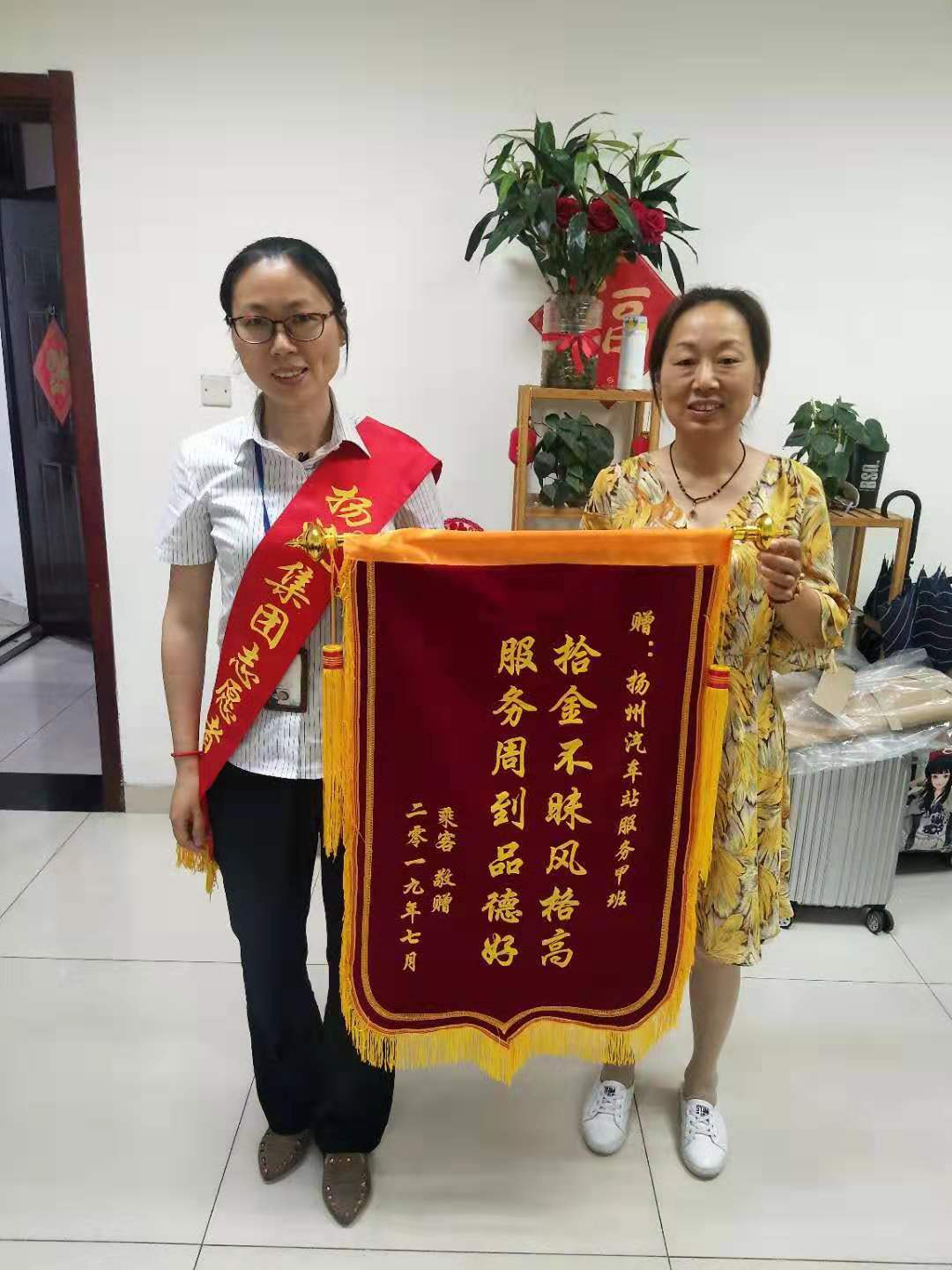 7月8日,一位揚州市民王大媽,拿著錦旗來到揚州汽車站值班室,感謝車站服務(wù)班工作人員,幫她尋找到遺失的錢包。