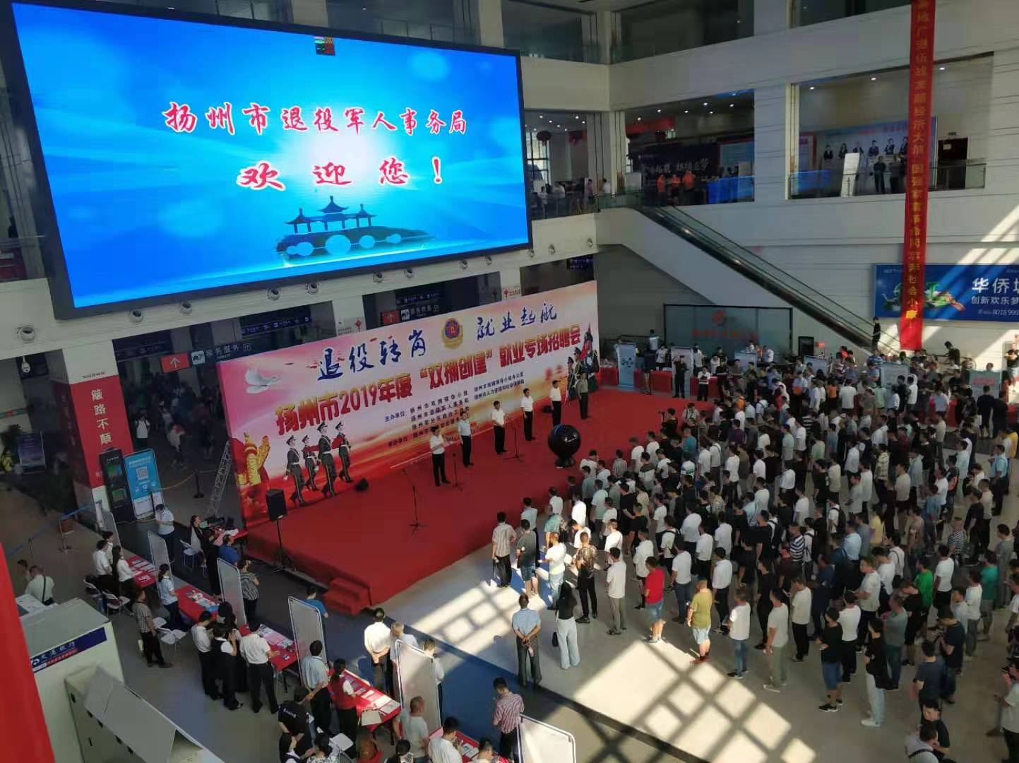 8月17日上午,揚(yáng)州市2019年度“雙擁創(chuàng)建”就業(yè)專場招聘會在揚(yáng)州西部客運(yùn)樞紐揚(yáng)州汽車站一樓大廳舉辦。會場設(shè)置50多個招聘席位,計劃安排1500個就業(yè)崗位,1200余名退役軍人及隨軍家屬參加現(xiàn)場招聘。招聘活動由揚(yáng)州市雙擁領(lǐng)導(dǎo)小組、揚(yáng)州市退役軍人事務(wù)局、揚(yáng)州軍分區(qū)、揚(yáng)州市人社局聯(lián)合主辦,旨在拓寬退役軍人就業(yè)渠道,為退役軍人和企業(yè)之間搭建起互通橋梁。
