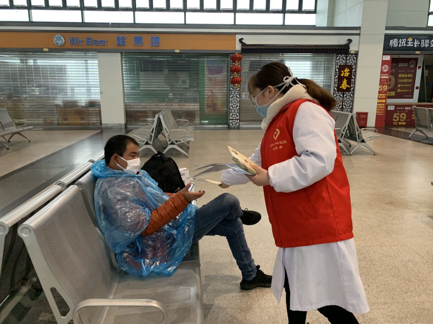 2月25日揚(yáng)州站復(fù)工復(fù)產(chǎn)的第二天,揚(yáng)州市中醫(yī)院抗“疫”小分隊(duì)為揚(yáng)州汽車(chē)站里的旅客們和堅(jiān)守在一線崗位的職工送來(lái)了抗疫藥品和義診服務(wù)。