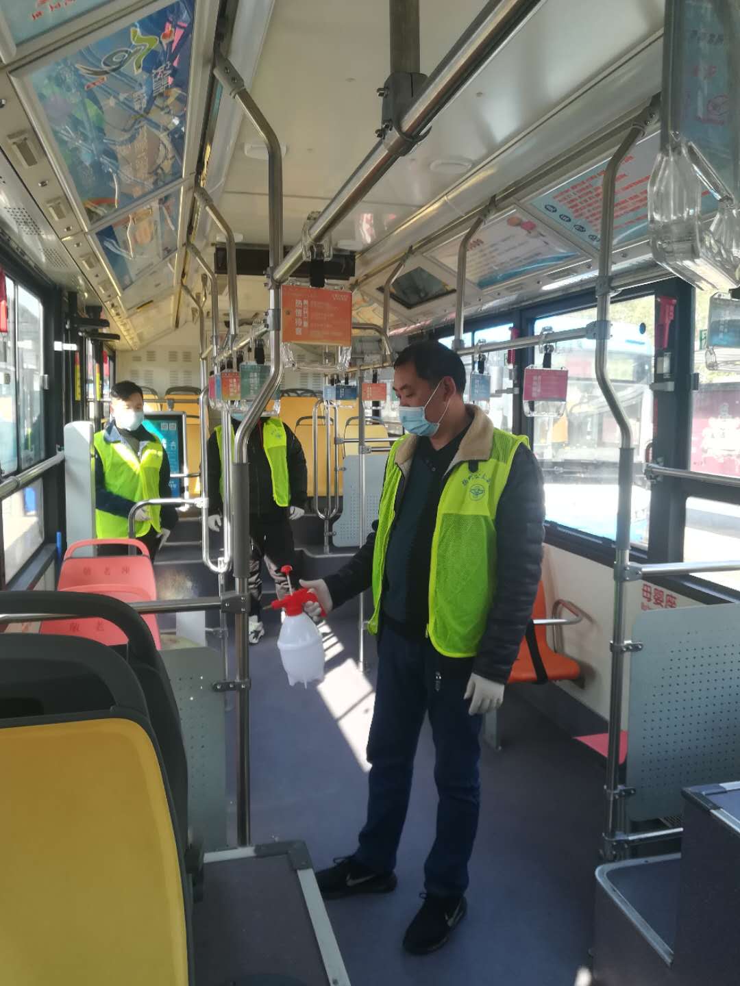 崗前培訓(xùn)后,志愿者們分工明確,在公交站的志愿者們拎著手持噴壺對待恢復(fù)營運(yùn)線路車輛的地面、扶手、座位進(jìn)行消毒工作,確保做到不留死角;在車站的志愿者們,協(xié)助車站工作人員做好旅客引導(dǎo)工作,測量體溫、以及掃碼登記等。