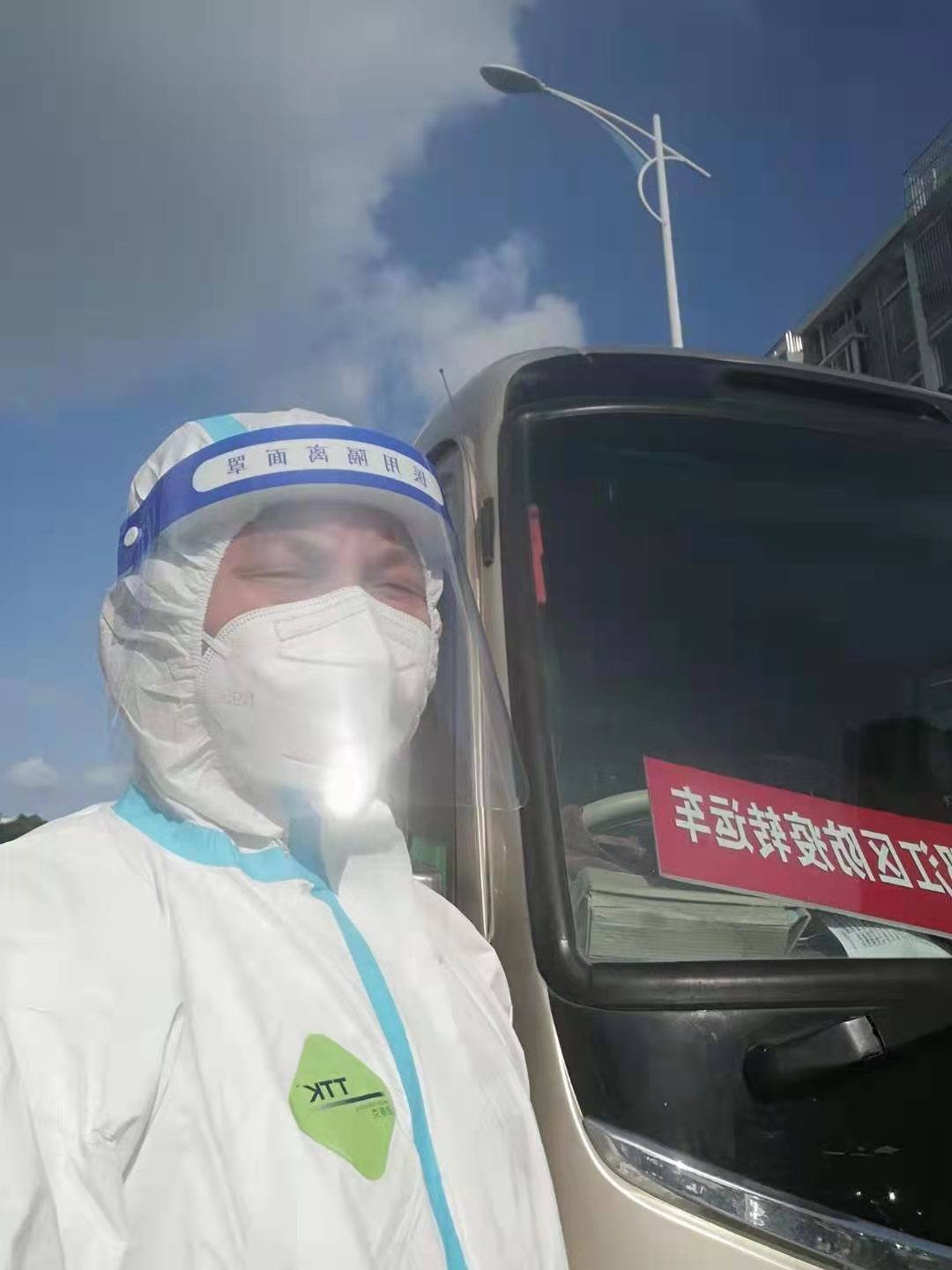 轉(zhuǎn)運(yùn)工作異常艱苦,尤其是轉(zhuǎn)運(yùn)初期,大量的人員需要轉(zhuǎn)運(yùn)至隔離區(qū),畢克駐在一線全天24小時(shí)待命,接到任務(wù)立即穿戴防護(hù)服出發(fā),最多的時(shí)候每天轉(zhuǎn)運(yùn)15趟次,只能睡三四個(gè)小時(shí)。疫情就是命令,生命重于泰山,防控的過(guò)程,就是與時(shí)間賽跑的過(guò)程。7、8月份正值高溫酷暑,他穿著封閉的防護(hù)服,一遍遍的從小區(qū)將次密者送到隔離點(diǎn),每轉(zhuǎn)接一次,就要換一身防護(hù)服,渾身的汗水揮發(fā)不掉,硬是悶在密閉的防護(hù)服中,一天下來(lái),皮膚被汗水浸泡的發(fā)白,手掌反復(fù)蛻皮。高溫高濕的環(huán)境、高強(qiáng)度的工作所帶來(lái)的考驗(yàn)一般人難以忍受,而他卻日復(fù)一日重復(fù)著同樣的經(jīng)歷。
