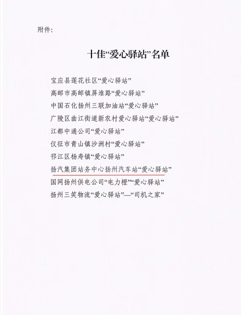 近日,揚(yáng)州市總工會(huì)印發(fā)《關(guān)于命名2022年度十佳“愛心驛站”的通報(bào)》,揚(yáng)汽集團(tuán)站務(wù)中心揚(yáng)州汽車站榮獲十佳“愛心驛站”榮譽(yù)稱號(hào)。
