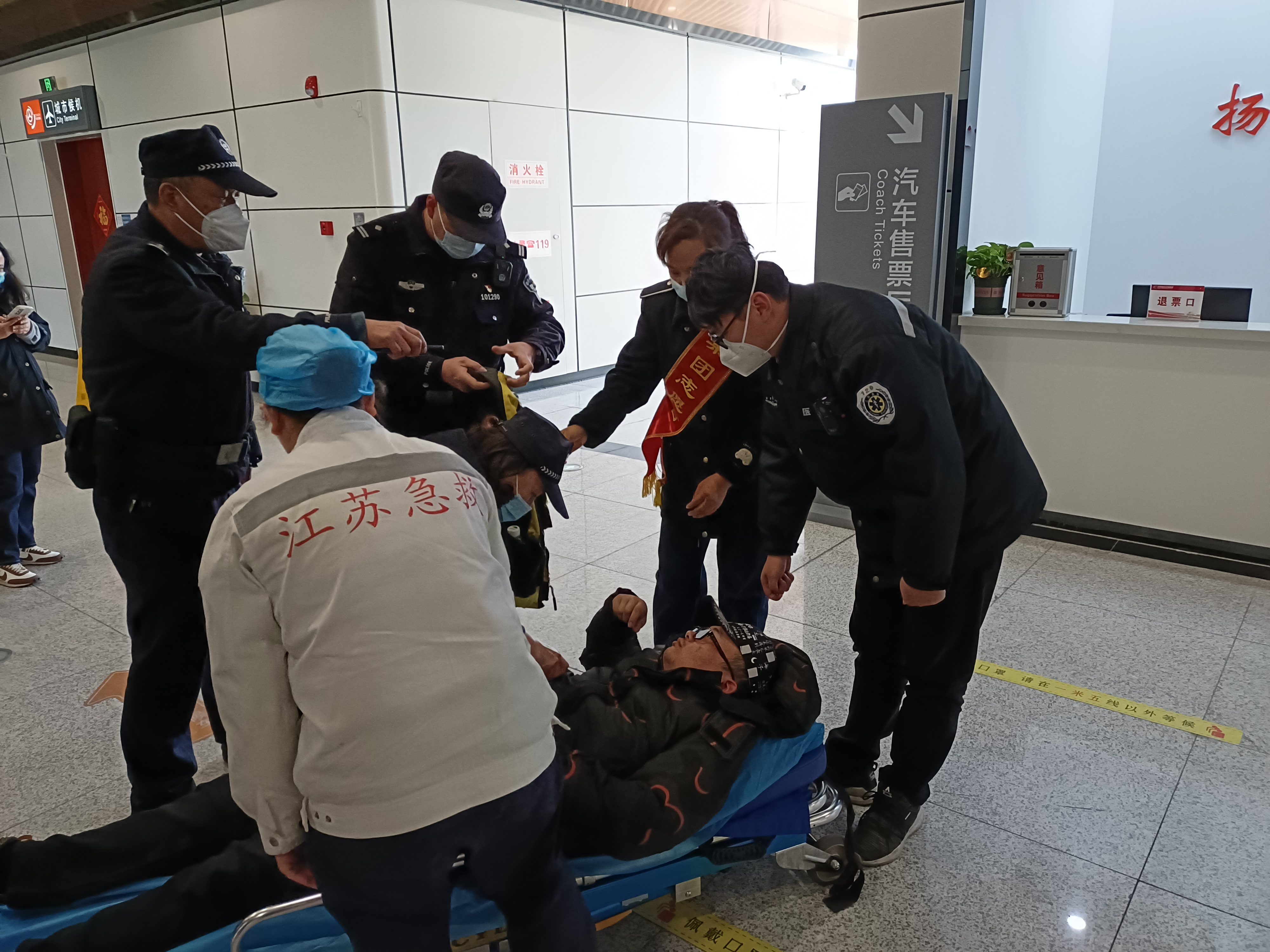 2月16日下午,揚(yáng)州東樞紐汽車站售票處,一名正在購票的旅客突發(fā)癲癇,暈倒在地,現(xiàn)場工作人員及志愿者立即進(jìn)行了救助。