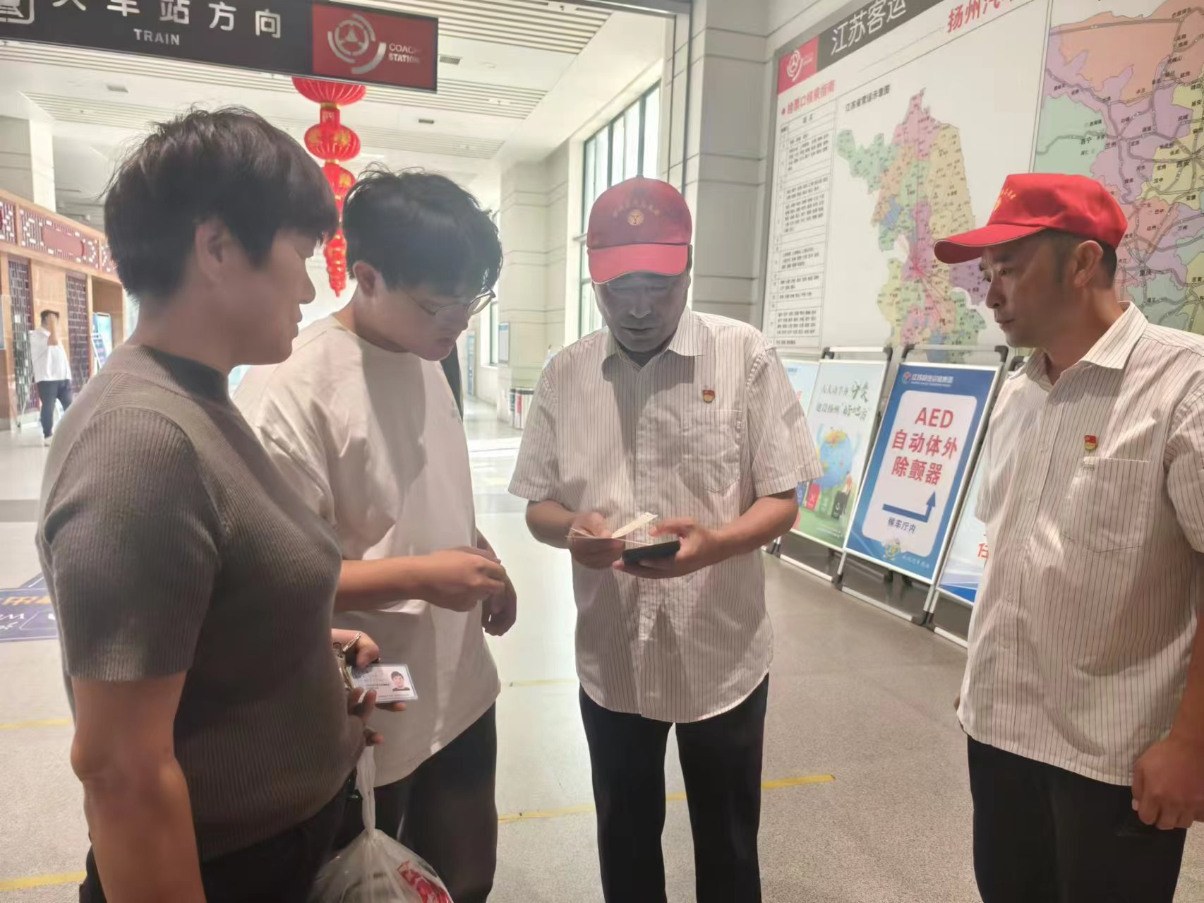 志愿者們有序在車站的售票廳、候車廳、安檢處、發(fā)車平臺等崗位為旅客提供文明勸導(dǎo)、秩序維護、行李搬運、茶水服務(wù)等志愿服務(wù),并耐心解答旅客的每一個問題,細心指引旅客前往購票窗口、候車區(qū)、檢票口等關(guān)鍵位置,確保每一位旅客都能順利、愉快地踏上旅程。針對老弱病殘孕等重點旅游群體,志愿者們熱情為其提供“一對一”重點幫扶,全力保障旅客群體安全便捷出行。在揚州汽車站候車大廳、汽車東站服務(wù)臺均設(shè)立了黨員示范崗,黨員志愿者們亮明身份,主動接受旅客監(jiān)督。